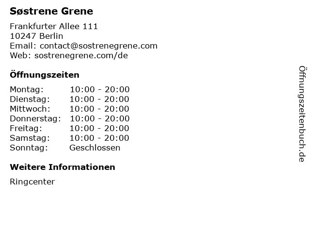 Sostrene Grene Ring Center. Søstrene Grene ist dänisch und bedeutet die Grene-Schwestern. 02 km SU Frankfurter Allee S42. Laden öffnungszeiten. Email an Søstrene Grene.